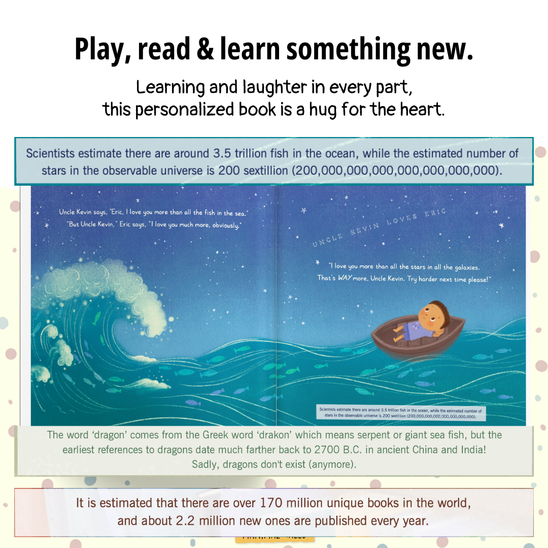 A personalized activity book with your child’s name in every puzzle, maze, and quiz. Add upto 8 family members into the activities! Packed with hours of screen-free fun for curious boys and girls!
